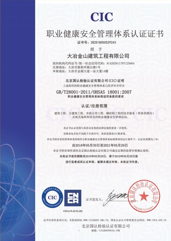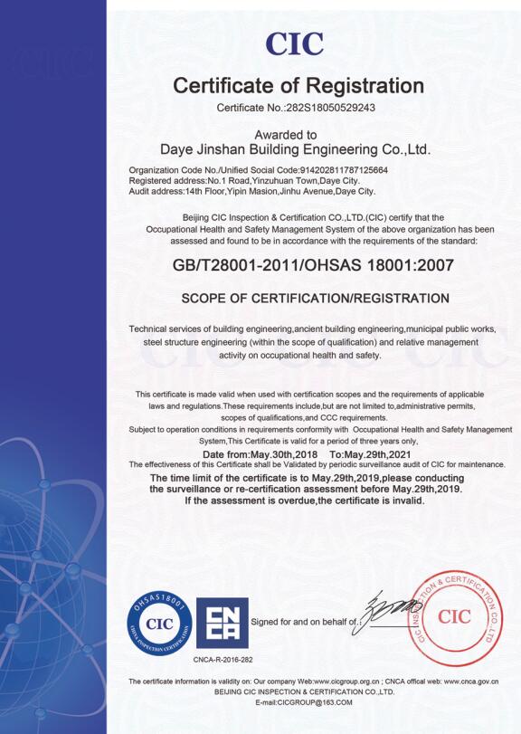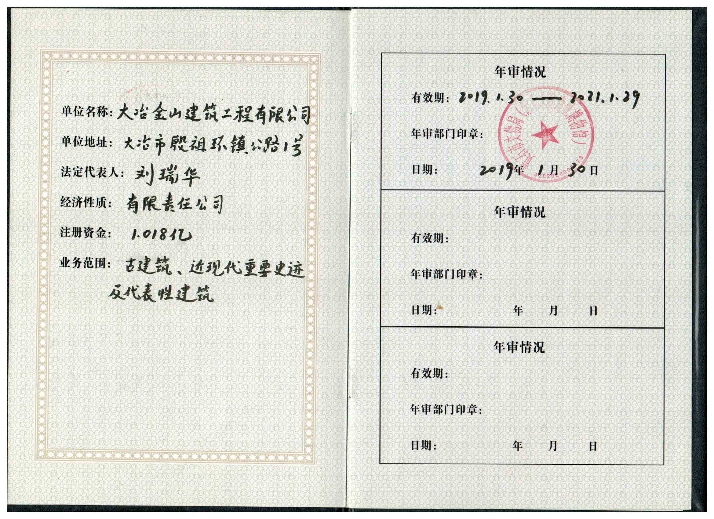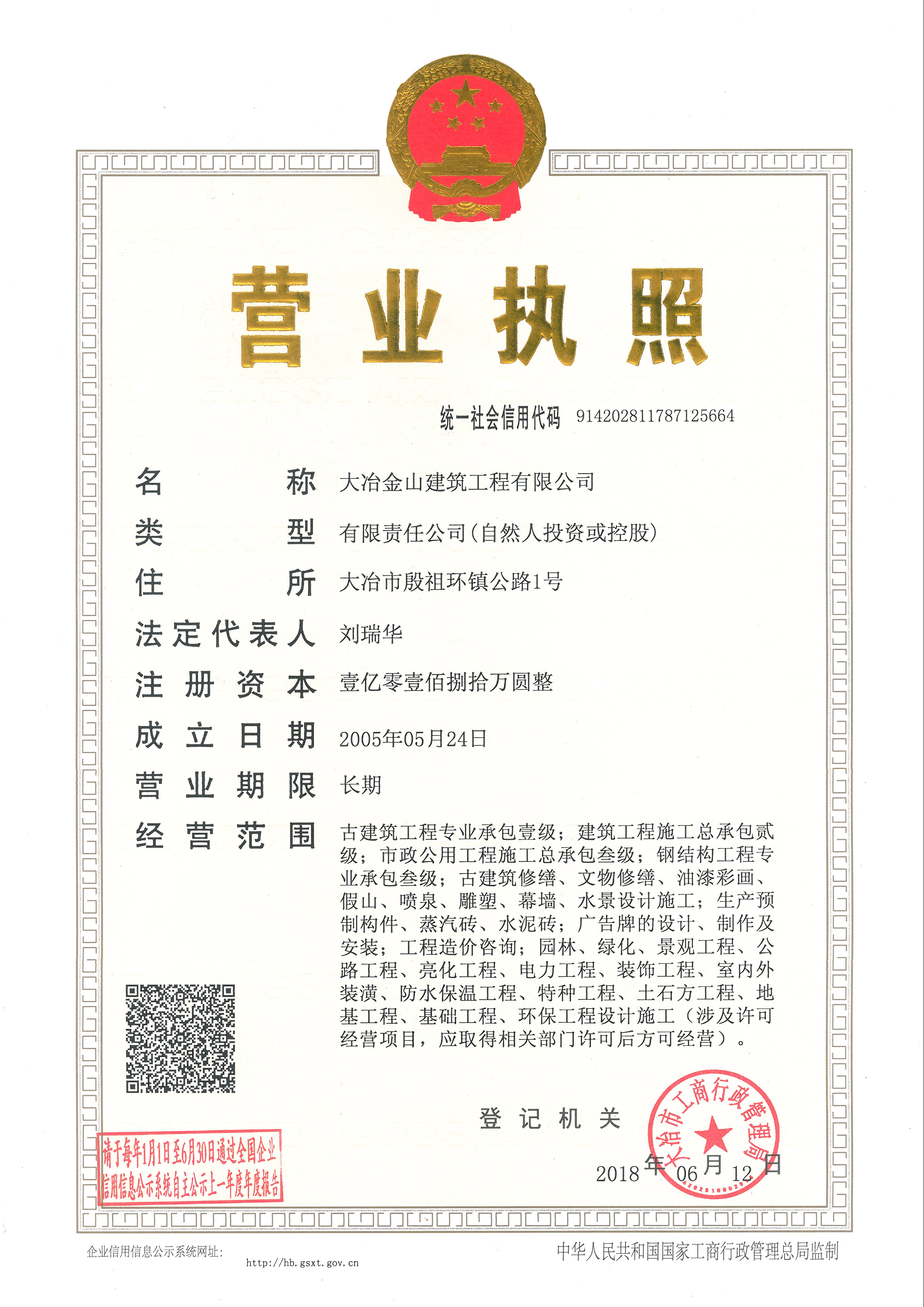 大冶金山建筑工程有限公司始建于1984年,屬鎮(zhèn)辦集體企業(yè)。1997年改制為大冶山建筑工程有限責(zé)任公司,屬股份制企業(yè)。2013年更名為大冶金山建筑工程有限公司,2018年3月公司資源重組,公司注冊資金達到10180.00萬元,公司法定代表人為劉瑞華。公司具有古建筑工程專業(yè)承包壹級、建筑工程施工總承包貳級、市政工程總承包叁級、鋼結(jié)構(gòu)工程專業(yè)承包叁級資質(zhì)。